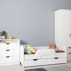 Ваш подрастающий малыш несомненно оценит изящный дизайн кроватки, а удобный съемный бортик придаст уверенность ответственным родителям в безопасности детского сна. Все элементы кровати предусмотрительно избавлены от острых углов и оформлены более толстой кромкой. Выкатные ящики - это вместительная система хранения для вещей и игрушек вашего ребенка. Удобный шкаф для одежды дополнен двумя выдвижными ящиками, что значительно увеличивает функциональность изделия. Комод оснащён складным пеленальным столиком.