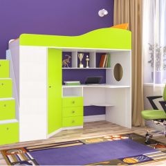 Двухъярусная кровать-чердак «Кадет-1» с рабочей зоной и универсальной лестницей - практичный и стильный предмет меблировки. Современная и стильная мебель для детской комнаты школьника, в которой предусмотрено не только наличие полноценной удобной кровати, но также просторный рабочий стол, над которым расположены полки для книг или декоративных мелочей, тумбочка с ящиками, полки и шкаф для одежды. Детская двухъярусная кровать помогает экономить и рационально использовать пространство комнаты, так как соединяет в себе несколько предметов мебели, при этом занимает место только для одной кровати.
