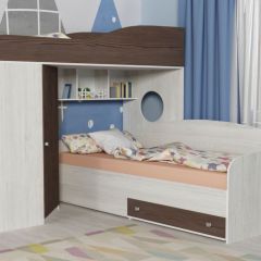 Такая кровать придется по душе и ребенку младшего школьного возраста, и подростку. Два просторных спальных места, четыре глубоких вместительных выдвижных ящика, замаскированных под ступеньки, вертикальный шкаф для одежды и компактные полочки для сувениров - все это дает колоссальную экономию места в Москве. Это особенно актуально для небольших малогабаритных помещений. Сочетание прямых, диагональных и плавных линий создает оригинальный дизайн.