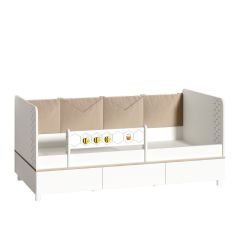 Кровать оснащена съёмным мягким элементом с карманами, передвижным бортиком и декорирована оригинальным рисунком - мультяшными пчёлками, которые никого не оставят равнодушным. Система хранения.