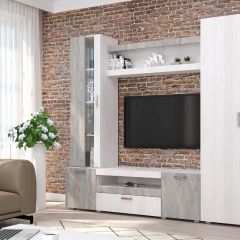 Данная стенка выполнена в современном сочетании цветов ясень анкор светлый с бетонным камнем.