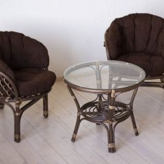 Комплект из натурального ротанга, состоящий из двух кресел и круглого столика с плетеной столешницей. Стекло входит в комплект.