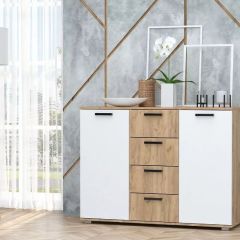 Комод имеет 4 выдвижных ящика в центре и 2 боковых отделения с полкой за распашной дверцей. Функциональный комод может служить подставкой под декор, косметику и местом хранения разнообразных вещей.