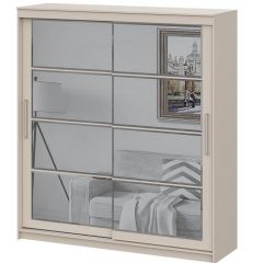 Внутреннее наполнение шкафа включает удобные полки и два выдвижных ящика с одной стороны, а также вместительную платяную секцию с надёжной металлической штангой для одежных вешалок за другой створкой. Нижнеопорная система раздвижных створок обеспечивает лёгкое и ровное открытие.